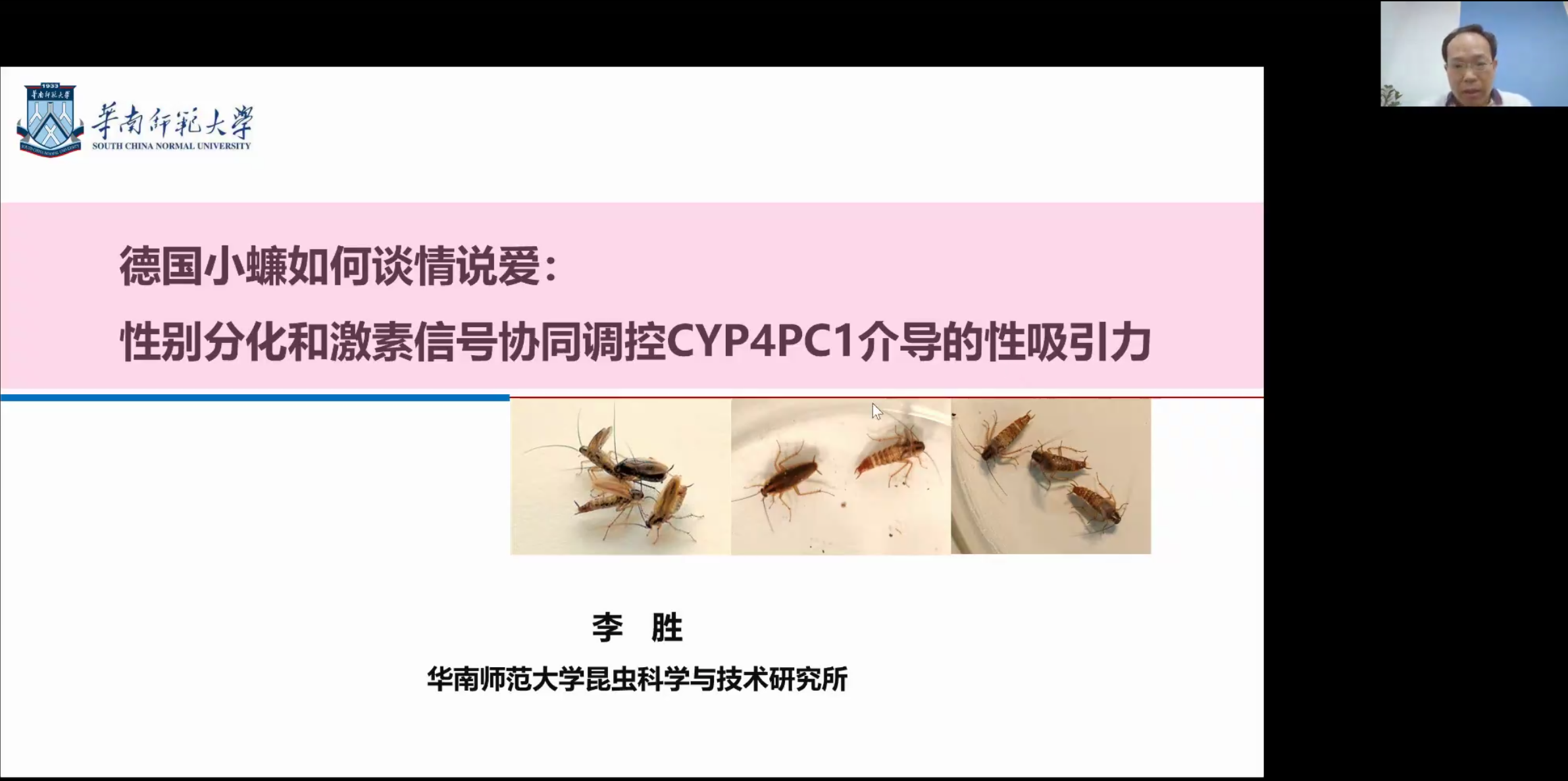 華南師范大學(xué)李勝教授風(fēng)趣的為我們介紹了德國(guó)小蠊性激素調(diào)控相關(guān)研究。研究團(tuán)隊(duì)通過(guò)轉(zhuǎn)錄組及相關(guān)驗(yàn)證實(shí)驗(yàn),在觸角中找尋到雄蟲中表達(dá)量高于雌蟲基因的CYP4PC1基因,該基因可能是控制信息素合成的關(guān)鍵基因。通過(guò)基因敲除的方式進(jìn)一步從表型中驗(yàn)證了CYP4PC1在信息素的產(chǎn)生和求偶的過(guò)程中具有重要的作用。后續(xù)研究表明,性別分化基因控制性二型CYP4PC1表達(dá)與調(diào)控,性別分化和激素信號(hào)協(xié)同調(diào)控CYP4PC1性吸引力,并使得小蠊成熟時(shí)只有一種性別具有性吸引力。最后李教授表明,通過(guò)性別分化和激素信號(hào)協(xié)同調(diào)控性吸引力可能在昆蟲和哺乳動(dòng)物中普遍存在。