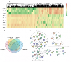 為了探討針刺治療心肌梗死的機(jī)制,作者利用納米孔完成了不同組的基因表達(dá)檢測。RNA-seq結(jié)果顯示,與對照組相比,MI組有5083個差異表達(dá)基因,PC6組與MI組相比有324個差異表達(dá)基因。通過聚類分析將對照組、MI組和PC6組中上調(diào)和下調(diào)基因制作熱圖和維恩圖,發(fā)現(xiàn)MI組2773個差異基因上調(diào),針刺治療下調(diào)了其中的65個差異基因,同時,在MI組的2308個下調(diào)的差異基因中,針刺治療可逆轉(zhuǎn)19個差異基因的表達(dá)。作者推測這84個差異基因可能是針刺抗心肌缺血作用的關(guān)鍵靶點。基于STRING數(shù)據(jù)庫對MI和PC6共同調(diào)控的差異基因進(jìn)行蛋白-蛋白相互作用(PPI)網(wǎng)絡(luò)分析。結(jié)果表明,蛋白質(zhì)主要富集了4類,主要包括:炎癥反應(yīng),肌動蛋白細(xì)胞骨架的調(diào)節(jié),I型干擾素介導(dǎo)的信號通路,以及RNA聚合酶II基因DNA在核外周的轉(zhuǎn)錄依賴鏈。