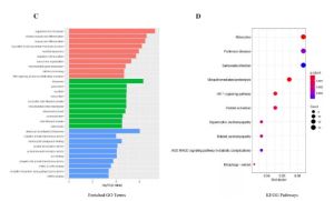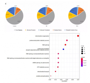 差異AS分析結(jié)果顯示,本研究共鑒定出347個差異AS事件,其中上調(diào)174個,下調(diào)173個。AS上調(diào)事件數(shù)量與AS下調(diào)事件數(shù)量相同。與對照組相比,MI組有129例AS事件差異上調(diào),147例AS事件差異下調(diào)。與MI組相比,PC6組有45個AS事件差異上調(diào),26個AS事件差異下調(diào)。通過GO和KEGG富集分析,作者發(fā)現(xiàn)這些基因富集的前10個通路包括核糖體、HIF-1信號通路、肥厚型心肌病、擴(kuò)張型心肌病。結(jié)果表明,這些參與差異AS事件的基因與心臟病有關(guān)。