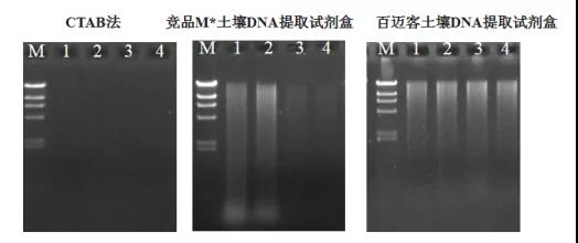 結(jié)論:CTAB法不適合土壤DNA提??;競品M*提取的DNA中有RNA的污染,DNA純度不高;百邁客土壤DNA提取試劑盒提取的DNA純度高,可用于后續(xù)的PCR實(shí)驗(yàn)。