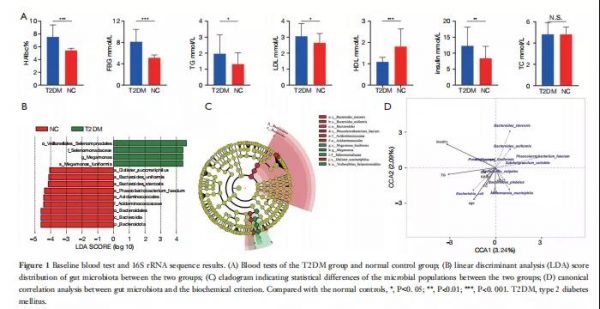 作者利用PICRUSt軟件獲得與OTU相對應(yīng)的KEGG信息(圖3A)。觀察到腸道細(xì)菌功能基因代謝途徑的一些差異,如B.uniformis、B.plebeius、B.taiotaomicron、P.faecium和 Faecalibacterium.sp。這些腸道細(xì)菌在氨基酸、碳水化合物、多糖、維生素、輔助因子、膜轉(zhuǎn)運和能量轉(zhuǎn)換的代謝中起著重要的調(diào)節(jié)作用。由于正常對照組和II型糖尿病組之間的B.uniformis 和P.faecium存在顯著差異,因此對腸道微生物群和血液指標(biāo)進(jìn)行了CCA分析,結(jié)果表明B.uniformis 和 P.faecium與胰島素、FBG、LDL和TG呈負(fù)相關(guān)。