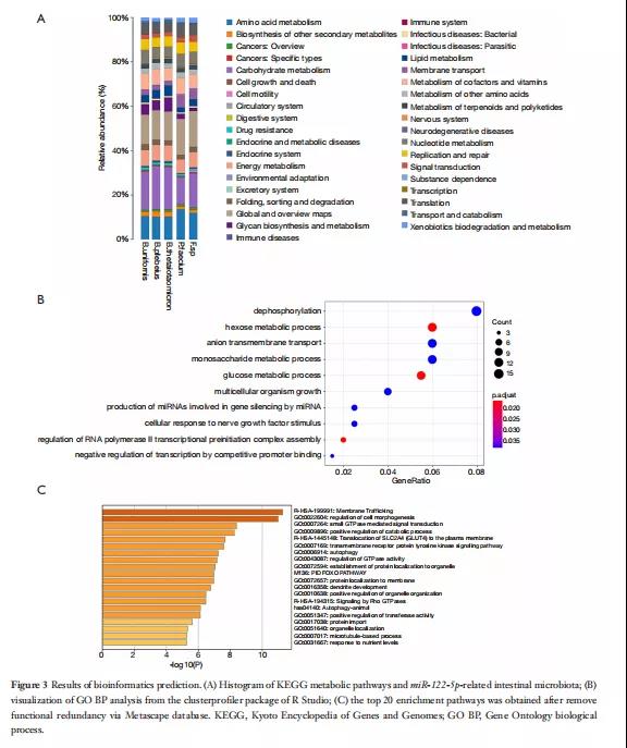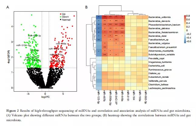 通過行Spearman相關(guān)分析。圖2B顯示了一個熱圖,描繪了五個與某些微生物區(qū)系具有統(tǒng)計顯著正相關(guān)和負(fù)相關(guān)的miRNA(P<0.05)。在這五種miRNA中,miR-122-5p在哺乳動物的進(jìn)化過程中高度保守,與八種腸道細(xì)菌相關(guān),包括兩種腸道細(xì)菌B.uniformis和P.faecium,它們有顯著差異(分別為P=0.023和0.031)。