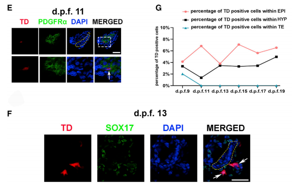 為研究食蟹猴胚胎中hEPSC的發(fā)育潛力,本研究使用幾種胚胎和胚胎外譜系特異性抗體進 行了免疫熒光(IF)研究。在圍植入期(d.p.f.9),平均有10.2±7.2(n = 9)個iPS1-EPSCs被 發(fā)現(xiàn)(在NANOG+或OCT4+食蟹猴細胞內(nèi)或附近發(fā)現(xiàn)TD+ OCT4+細胞)(圖 2A)。盡管這些 細胞表達OCT4,但只有少數(shù)細胞表達NANOG(圖 S1C),沒有在這些細胞中觀察到GATA6 表達(一種下胚層【HYP】標(biāo)記)(圖 S1C)。 此外,還檢測到TD+GATA4+ HYP-like細胞 (圖 2B)。與小鼠中報道的結(jié)果相反(Yang et al., 2017),在食蟹猴囊胚的滋養(yǎng)外胚層 (TE)層中僅檢測到少數(shù)iPS1-EPSC表達了TE標(biāo)記基因(例如TFAP2C和CK7)(圖 2C)。 在d.p.f.11時,食蟹猴胚胎的EPI層也檢測到TD+OCT4+細胞,這些細胞很少表達原腸胚形成標(biāo)志物T+(也稱為Brachyury)。相比之下,在胚胎的背側(cè)羊膜處檢測到T+食蟹猴細胞(圖 2D)。此外,在食蟹猴HYP細胞內(nèi)發(fā)現(xiàn)表達HYP標(biāo)志物、血小板衍生生長因子受體-α (PDGFRα)的TD+人類細胞(圖 2E)。在EPI層外發(fā)現(xiàn)了表達COL6A1的OCT4+人類細胞, COL6A1是胚胎外間充質(zhì)細胞(EXMC)的標(biāo)志物,表明hEPSC正在向EXMC分化(圖 S1D)。在 d.p.f.13時,EPI層下方檢測到hEPSCs并表達內(nèi)胚層標(biāo)記物SOX17,表明它們已啟動 原腸胚形成(圖 2F)。有趣的是,本研究發(fā)現(xiàn)從d.p.f.13開始,人類細胞傾向于聚集在一起并 與食蟹猴EPI層分離,通過檢測OTX2和OCT4的表達,發(fā)現(xiàn)這些人類細胞似乎已分化為原腸細 胞(Martyn et al., 2018; Vincent et al., 2003)(圖 S1E)??偟膩碚f,hEPSCs對EPI的貢獻較高 (在d.p.f.15時的最高貢獻值為7.08%),對HYP的貢獻相對較低(在d.p.f.19時的最高貢獻為 4.96%)(圖 2G)。