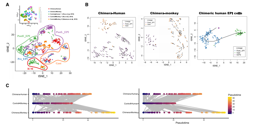 本研究結(jié)果初步證實了胚胎發(fā)育早期人類和猴細胞混合時發(fā)生的細胞和分子事件,結(jié)果揭示了靈長類動物胚胎發(fā)生過程中的進化趨同和發(fā)散的過程。這一系列基礎(chǔ)研究將有助于改善進 化距離更遠的物種的人類嵌合現(xiàn)象,出于各種原因,包括社會、經(jīng)濟和倫理,這些物種可能更 適合再生醫(yī)學(xué)轉(zhuǎn)化療法。
