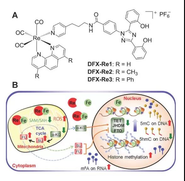 文章設(shè)計(jì)了三個(gè)線粒體靶向錸(I)配合物,其中加入了一種臨床鐵螯合劑脫鐵石(DFX),以同時(shí)干擾線粒體代謝和鐵穩(wěn)態(tài)。其中,DFX-Re3可以將細(xì)胞鐵遷移到線粒體,干擾線粒體代謝,包括與表觀遺傳修飾相關(guān)的關(guān)鍵代謝物。