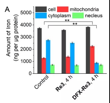 (1)ICP-MS實(shí)驗(yàn):DFX-Re3將細(xì)胞中鐵轉(zhuǎn)移到線粒體