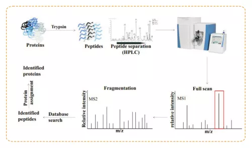 蛋白質(zhì)質(zhì)譜鑒定的基本原理是用蛋白酶將蛋白質(zhì)消化成肽段混合物,經(jīng)MAILDI或ESI等軟電離手段將其離子化,然后通過質(zhì)量分析器將具有特定質(zhì)核比的肽段離子分離開來。通過實際譜圖和理論上蛋白質(zhì)經(jīng)過蛋白酶消化后產(chǎn)生的一級質(zhì)譜峰圖和二級質(zhì)譜峰圖進(jìn)行的比對,進(jìn)行蛋白鑒定。