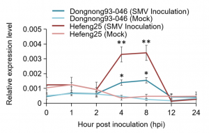 作者進(jìn)一步通過表達(dá)分析、遺傳轉(zhuǎn)化分析等方法驗(yàn)證GmST1基因?qū)Υ蠖够ㄈ~病毒的抗性,通過qRT-PCR和RNA-seq對SMV抗性株系Dongnong93-046和SMV-感性株系Hefeng25的不同組織進(jìn)行分析,分析結(jié)果表明,GmST1基因受SMV感染調(diào)控,且該基因在抗SMV和易感SMV大豆品種之間存在差異表達(dá)。通過轉(zhuǎn)基因過表達(dá)遺傳轉(zhuǎn)化實(shí)驗(yàn)發(fā)現(xiàn),GmST1的RSVG2-R等位基因提升了大豆對SMV G2和G3菌株的抗性。最終發(fā)現(xiàn)編碼磺基轉(zhuǎn)移酶的GmST1基因, 賦予大豆對大豆花葉病毒G2和G3株的抗性。