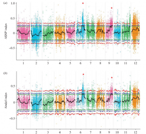 本研究在Longjiang25(耐冷)和Longjiang11(不耐冷)雜交構(gòu)建的F2群體中(245份材料),挑選50個(gè)耐冷和50個(gè)不耐冷極端材料分別進(jìn)行混池測序,親本各10×,子代分別是67×和80×,進(jìn)行BSA分析;利用SNP index 和indel index方法進(jìn)行性狀與標(biāo)記的關(guān)聯(lián),最終將候選區(qū)域定位到6號(hào)染色體和9號(hào)染色體上的0.82Mb區(qū)域內(nèi),分析發(fā)現(xiàn)這些區(qū)域共包含98個(gè)注釋基因。