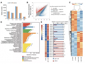 作者對低溫脅迫(12℃)條件下,對第0、2、4天水稻花序上3.5-4.5mm的幼穗進(jìn)行取樣, 做 RNA-seq分析 ,分析兩親本在低溫脅迫條件下,差異基因表達(dá)情況。結(jié)合BSA關(guān)聯(lián)分析的定位區(qū)間,發(fā)現(xiàn)候選區(qū)域內(nèi)有50個(gè)差異表達(dá)基因。通過對差異表達(dá)基因進(jìn)行GO和KEGG富集功能分析結(jié)合功能富集分析,確定4個(gè)(Os09g0514200、Os09g0516500、Os09g0516600和Os09g0511600)潛在候選基因與耐寒性相關(guān);進(jìn)一步通過qRT-PCR驗(yàn)證這4個(gè)基因的表達(dá)情況,結(jié)果顯示與轉(zhuǎn)錄組表達(dá)一致。