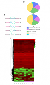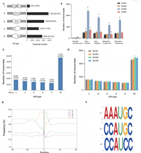 APA和AS的鑒定增強了我們對轉錄異構體多樣性生物學作用的理解。在本研究中,確定了9035例AS事件,并將其分為五類(圖2)。在檢測到的全部轉錄本中,有6.86%由某種可變剪切形式產(chǎn)生,其中內含子保留是最常見的可變剪切事件。此外,在88092個基因位點上進一步確定了207955個APA事件。