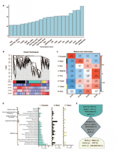 共鑒定出4251個TFs,屬于208個基因家族。其中最豐富的是AP2/ERF(176)、MYB相關(135)和bHLH(133)(圖4A),同時WGCNA分析也確定了與羅浮買麻藤莖發(fā)育高度相關的八個TFs模塊(圖4B、C)。綠松石色(編號1,315 TFs)、黑色(編號2,215 TFs)和黃色(編號7,75 TFs)最富集。綠松石色模塊中的TF主要在GLN01中表達,而黑色和黃色模塊中的TF分別在GLN02和GLN04中密集表達(圖4B、C)。很明顯,綠松石色模塊中的TFs主要通過三種KEGG途徑富集,“淀粉和蔗糖代謝”(11 TFs,ko00500)、“淀粉和蔗糖代謝”(8 TFs,ko00500)和“戊糖和葡萄糖醛酸鹽相互轉化”(6 TFs,ko00040)(圖4D)。類似地,黑色模塊中的TFs主要富集于“植物-病原體相互作用”(6 TFs,ko04626)、“碳代謝”(4TFs)和“苯丙烷生物合成”(4 TFs,ko00940),而黃色模塊中的TFs主要富集于“氰基氨基酸代謝”(2 TFs,ko00460)和“糖酵解/糖異生”(2 TFs,ko00010)。此外,還發(fā)現(xiàn)綠松石色模塊中bHLH、GRF和MYB相關蛋白高度表達;在黑色模塊中EGAP2/ERF、NAC和MYB高度表達;在黃色模塊中MYB、bZIP和PLATZ高度表達(圖4E)。