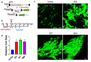 本文采用他莫昔芬對小鼠進(jìn)行處理,并手術(shù)誘導(dǎo)心肌梗死(MI)(圖 1a,b)。未受傷心肌和梗死區(qū)的共聚焦成像顯示MI后心臟成纖維細(xì)胞數(shù)量顯著增加,心臟成纖維細(xì)胞也變大了(圖1c,d))。