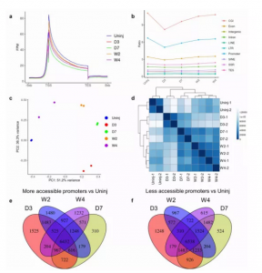 ATAC-seq:新鮮分選的來自小鼠未受傷心肌和心肌梗死后第3天、第7天、第2周、第4周梗死區(qū)的心臟成纖維細(xì)胞,每組設(shè)置兩個(gè)重復(fù)