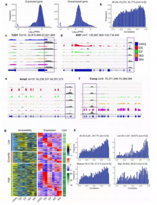 然后根據(jù)檢測到的啟動(dòng)子的可及性對它們進(jìn)行分類:高可及性組,低可及性組和動(dòng)態(tài)可及性組。發(fā)現(xiàn)在三個(gè)組中,很多基因的啟動(dòng)子可及性和轉(zhuǎn)錄水平有很強(qiáng)的相關(guān)性,但是在高可及性組中有一些基因的啟動(dòng)子可及性和轉(zhuǎn)錄組水平有著較弱的或者無相關(guān)性。有趣的是,具有高啟動(dòng)子可及性的基因具有最高的CpG密度,而具有低啟動(dòng)子可及性的基因具有最低的CpG密度(圖4g)。當(dāng)根據(jù)啟動(dòng)子中的CpG密度將5,431個(gè)差異表達(dá)基因分為3組時(shí),發(fā)現(xiàn)CpG密度較低但具有很強(qiáng)的正相關(guān)性的基因占比最高,進(jìn)一步表明DNA甲基化可以獨(dú)立調(diào)控基因轉(zhuǎn)錄,而與啟動(dòng)子染色質(zhì)可及性無關(guān)(圖4h)。