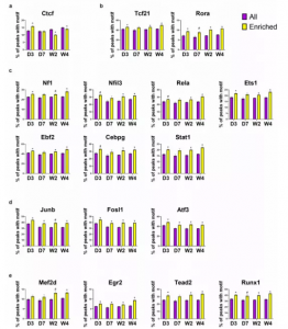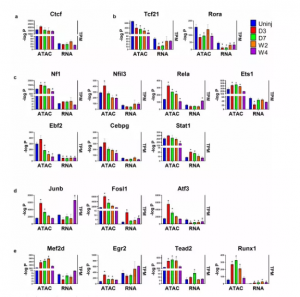 接下來分析每個(gè)分組中這17個(gè)TF motif在遠(yuǎn)端ATAC-seq 峰中的結(jié)合位點(diǎn),發(fā)現(xiàn)與未受傷組相比,對應(yīng)的靶基因在MI后的分組樣本的心臟成纖維細(xì)胞中是上調(diào)的。分析結(jié)果說明除了Ctcf,大多數(shù)MI后的分組樣本中的TF motif在遠(yuǎn)端ATAC-seq峰對應(yīng)的上調(diào)靶基因區(qū)域中的富集程度高于所有遠(yuǎn)端ATAC-seq峰(圖7a-e)。