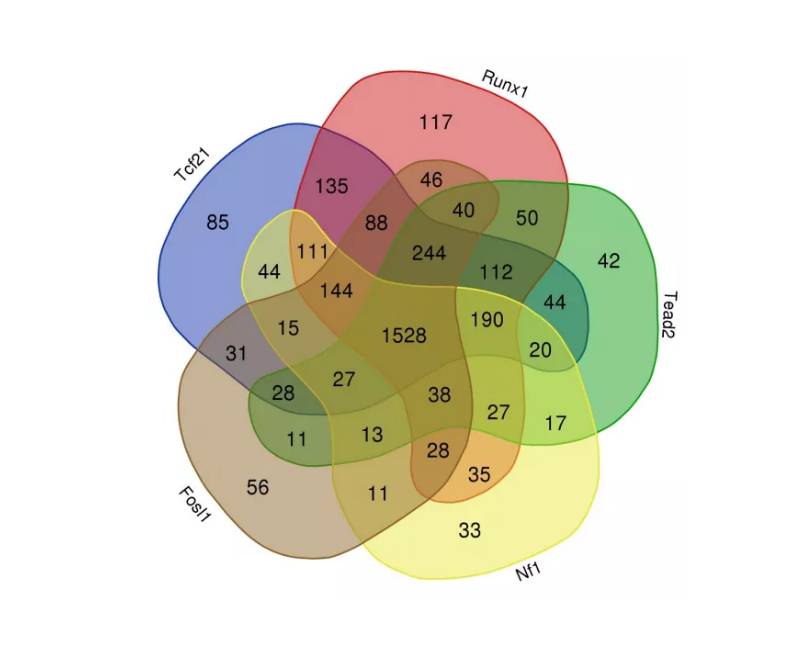 單個(gè)TF靶向的差異表達(dá)基因的比較結(jié)果揭示在Tcf21、Runx1、Tead2、Nf1 和 Fosl1 之間有著最大的交集(圖 8),表明許多與MI后心臟成纖維細(xì)胞的激活和分化相關(guān)的基因是受多個(gè)關(guān)鍵TF共同調(diào)節(jié)的。