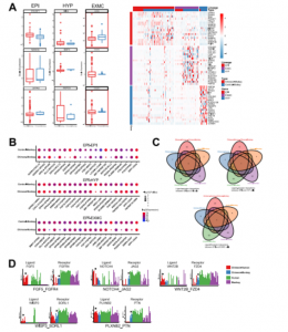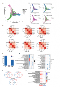 首先基于所有細(xì)胞的轉(zhuǎn)錄組學(xué)特性構(gòu)建了一個(gè)導(dǎo)向圖(SPRING),所有細(xì)胞分為三個(gè)分支:EPI、HYP和TE(圖 2A),明確了嵌合體和對照(人和食蟹猴)胚胎之間基因表達(dá)模式的相關(guān)性(圖 2B)。當(dāng)嵌合人類細(xì)胞與對照人類(0.460)或?qū)φ帐承泛铮?.459)細(xì)胞進(jìn)行比較時(shí),獲得了類似的相關(guān)系數(shù)(圖 2B,右圖),但與對照胚胎相比,嵌合猴細(xì)胞的相關(guān)系數(shù)高于嵌合人類細(xì)胞(圖 2B,左圖);接下來發(fā)現(xiàn)嵌合人EPI-like細(xì)胞與人胚胎中的EPI細(xì)胞相似,而嵌合人HYP和EXMC-like細(xì)胞分別與嵌合猴HYP和EXMCs細(xì)胞相關(guān)系數(shù)最高(圖 2C)。同時(shí)發(fā)現(xiàn)嵌合人類EPI-like細(xì)胞逐漸傾向于嵌合猴EPI細(xì)胞,R2值從0.363(植入前EPI [Pre_EPI])增加到0.464(植入后EPI [PostL_EPI]),再增加到0.693(原腸[Gast]細(xì)胞)(圖 2C)。以上結(jié)果表明猴胚胎微環(huán)境對人類細(xì)胞的基因轉(zhuǎn)錄狀態(tài)產(chǎn)生影響,反之亦然。