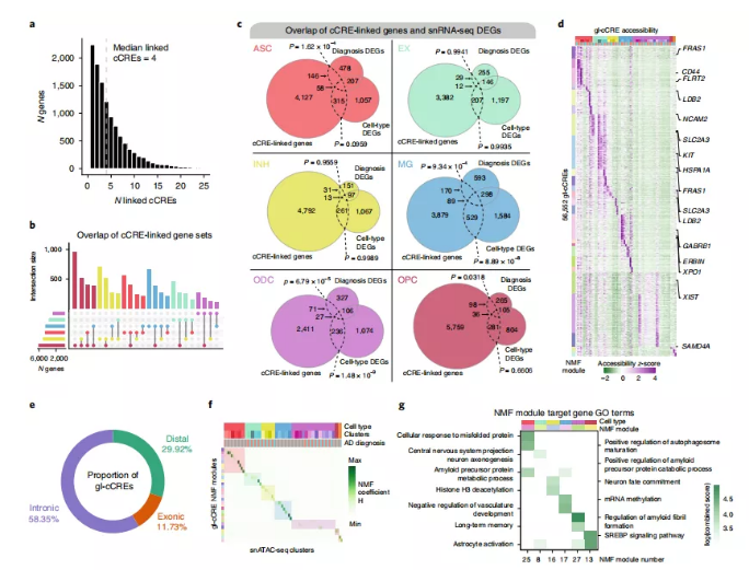 總的來說,使用這種方法共鑒定了56552個(gè)gl-cCREs和11440個(gè)cCREs連鎖基因,每個(gè)基因的中位數(shù)為4個(gè)cCREs(圖3a)。通過檢查在每個(gè)細(xì)胞類型中鑒定的cCREs連鎖基因組之間的重疊,研究人員發(fā)現(xiàn),除了那些細(xì)胞類型特異性的基因外,還有大量具有連鎖cCRE的基因在多種細(xì)胞類型中共享(圖3b)。在一些細(xì)胞類型中,研究人員發(fā)現(xiàn)cCREs連鎖基因與細(xì)胞類型標(biāo)記DEGs以及該細(xì)胞類型中在AD中上調(diào)的基因之間存在顯著重疊,這表明cCREs在疾病相關(guān)基因表達(dá)變化中發(fā)揮關(guān)鍵作用(圖3c)。研究人員還研究了這些gl-cCREs的每個(gè)snATAC-seq分群的染色質(zhì)可及性,并發(fā)現(xiàn)到細(xì)胞類型和分群高度特異性(圖3d)。大部分gl-cCREs定位于內(nèi)含子區(qū)域(58.35%;圖3e)。此外,通過檢查NMF系數(shù)矩陣(H),研究人員能夠識別每個(gè)NMF模塊對應(yīng)的分群或細(xì)胞類型,并注釋了幾個(gè)特定于控制晚期AD細(xì)胞核的模塊(圖3f、g)。此外,研究人員還發(fā)現(xiàn)一些在多種細(xì)胞類型中共有的cCRE靶基因在每種細(xì)胞類型中受不同的cCRE調(diào)控。