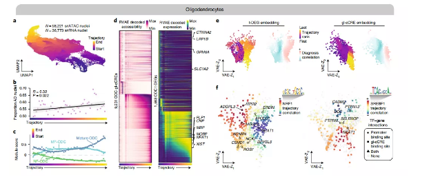 研究人員使用snATAC-seq的58221個(gè)細(xì)胞核和snRNA-seq的36773個(gè)細(xì)胞核構(gòu)建了一個(gè)完整的少突膠質(zhì)細(xì)胞軌跡(圖5a),發(fā)現(xiàn)AD晚期樣本的細(xì)胞核比例似乎沿著軌跡增加(圖5b)。為了闡明與晚期AD相關(guān)的少突膠質(zhì)細(xì)胞的功能狀態(tài),研究人員檢測了新形成的少突膠質(zhì)細(xì)胞(NF-ODCs)、髓鞘形成的少突膠質(zhì)細(xì)胞(MF-ODCs)和成熟的少突膠質(zhì)細(xì)胞(圖5c)。研究人員發(fā)現(xiàn)成熟ODC基因表達(dá)特征在軌跡的末端增加,而MF-ODC基因表達(dá)特征減少。此外,NF-ODC基因標(biāo)記在整個(gè)軌跡中全部降低,這表明少突膠質(zhì)細(xì)胞偽時(shí)間軌跡再現(xiàn)了少突膠質(zhì)細(xì)胞成熟過程。9231個(gè)少突膠質(zhì)細(xì)胞gl-cCREs的染色質(zhì)可及性和1563個(gè)用RVAE重建的少突膠質(zhì)細(xì)胞t-DEGs的基因表達(dá)表明,大量的染色質(zhì)重塑和轉(zhuǎn)錄重編程可能是少突膠質(zhì)細(xì)胞成熟的基礎(chǔ)(圖5d)。