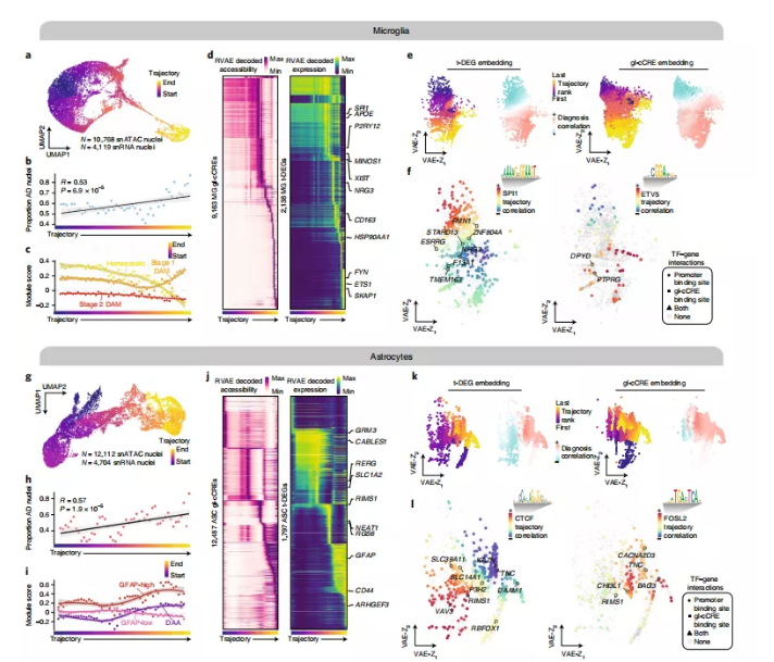 利用snATAC-seq的12112個(gè)細(xì)胞核和snRNA-seq的4704個(gè)細(xì)胞核構(gòu)建了一個(gè)完整的星形膠質(zhì)細(xì)胞軌跡(圖6h),同時(shí)發(fā)現(xiàn)AD晚期細(xì)胞核的比例在整個(gè)軌跡中顯著增加(圖6h)。與小膠質(zhì)細(xì)胞軌跡中的DAM信號的分析結(jié)果類似。研究人員研究了疾病相關(guān)星形膠質(zhì)細(xì)胞(DAAs)的基因信號,基于DAA基因特征分析,推斷這一軌跡遵循從GFAP低態(tài)到GFAP高態(tài)與DAA狀態(tài)的趨勢相似(圖6i)。