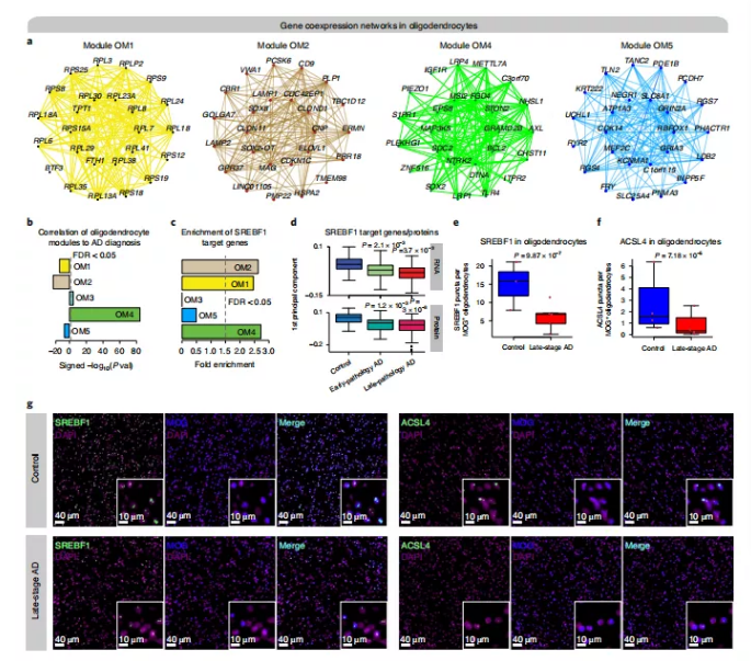 此外,研究人員在共表達(dá)網(wǎng)絡(luò)中檢查了SREBF1的下游調(diào)控靶基因。隨后又發(fā)現(xiàn)其中三個(gè)少突膠質(zhì)細(xì)胞顯著富集了SREBF1的靶基因,這表明SREBF1在調(diào)節(jié)這些模塊中的基因表達(dá)方面發(fā)揮重要作用(圖8c)。將批量RNA-seq、高通量蛋白質(zhì)組學(xué)、SREBF1-ChIP)以及ChIP-seq的數(shù)據(jù)確定了SREBF1靶基因的蛋白-蛋白相互作用(PPI)網(wǎng)絡(luò)。此外,研究人員發(fā)現(xiàn)SREBF1靶基因模塊的基因表達(dá)量在AD早期和晚期樣本的蛋白和RNA中下調(diào)(圖8d),證實(shí)snATAC-seq SREBF1基序的可變性。通過RNA原位雜交和免疫組織化學(xué)方法驗(yàn)證了SREBF1在晚期AD中的下調(diào),并發(fā)現(xiàn)ACSL4的表達(dá)在晚期AD中有所降低,ACSL4是ENCODE Chip-Seq數(shù)據(jù)中發(fā)現(xiàn)的SREBF1的靶點(diǎn)之一 (圖8e-g)??傮w而言,研究人員的共表達(dá)網(wǎng)絡(luò)分析方法有助于識別細(xì)胞類型特異性疾病,在少突膠質(zhì)細(xì)胞中發(fā)現(xiàn)了TF SREBF1,這在AD中基本上沒有研究過,表明其研究方法能夠?qū)膊‘a(chǎn)生新的見解。