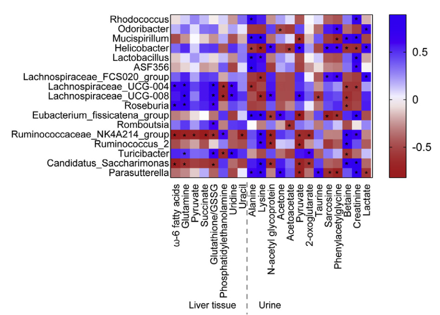 圖2.對照組和模型組在屬水平上受干擾的腸道微菌群和改變的肝和尿代謝物之間的相關(guān)性。