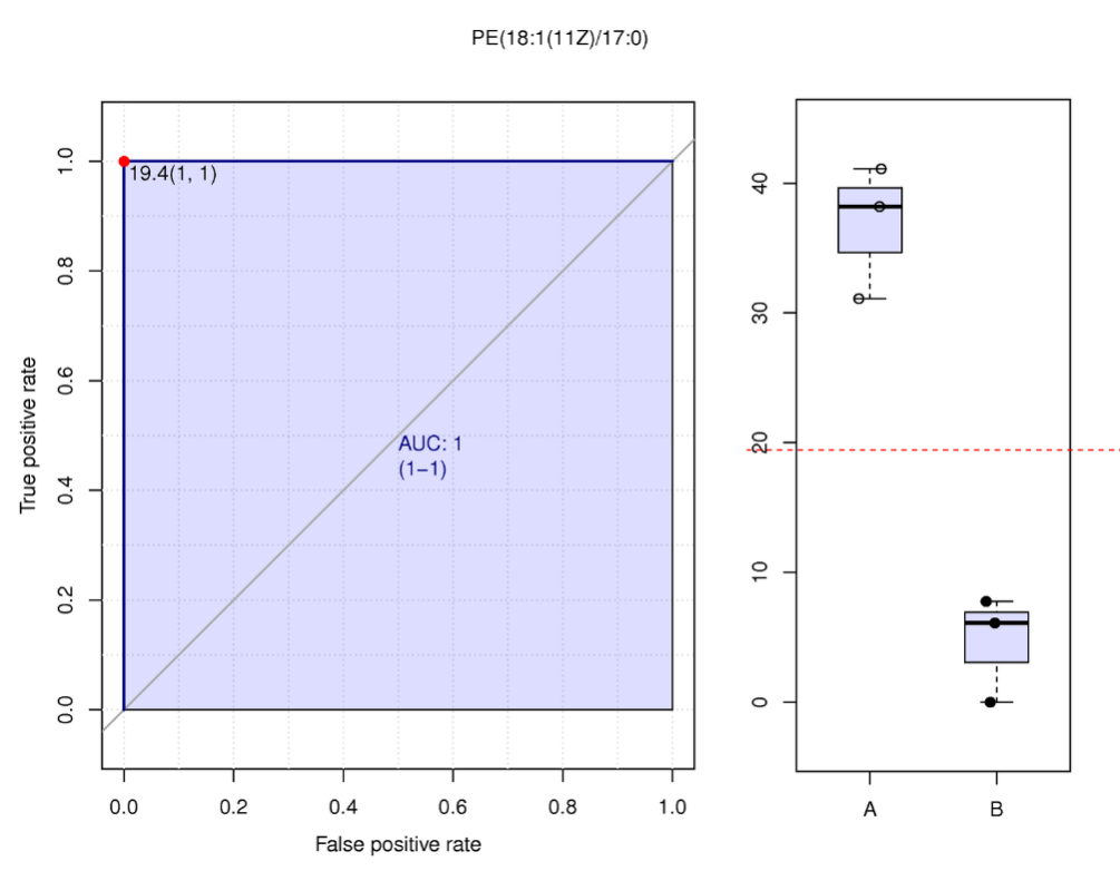 ROC曲線 (receiver operating characteristic curve) 是一種常用來篩選評估生物標(biāo)記物的分析方法[9]。AUC (Area under the curve) 是衡量ROC曲線非常有用的度量。AUC始終在0.5(兩個類在統(tǒng)計上相同)和1.0(有一個閾值可以實現(xiàn)類之間的完美分離)之間,越接近1,物質(zhì)的在對照組和實驗組的分離就越明顯(即為潛在的生物標(biāo)記物)。一般來說,組內(nèi)生物學(xué)重復(fù)>15時,ROC曲線才有足夠的點繪制折線,才會體現(xiàn)出較大意義。對篩選出的各組差異代謝物單獨進行ROC分析。