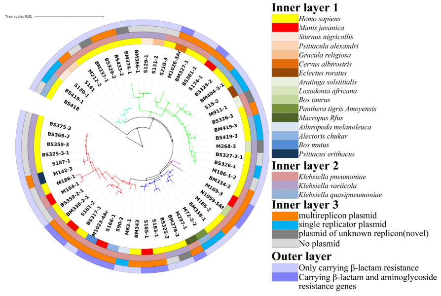 多復(fù)制子耐藥質(zhì)粒已成為革蘭氏陰性菌耐藥基因的重要載體,但多復(fù)制子質(zhì)粒的進(jìn)化尚不清楚。該研究采用微量肉湯稀釋法對2018年至2020年從不同野生動物和環(huán)境中分離到的56株克雷伯氏菌進(jìn)行了表型鑒定,并對其進(jìn)行了測序和分析,以進(jìn)行細(xì)菌全基因組關(guān)聯(lián)研究。結(jié)果表明,非人類來源的菌株對氨芐西林的耐藥率較高(80.36%),且耐藥范圍較廣。馬來亞穿山甲分離株對頭孢類抗生素高度耐受,同時對氯霉素、左氧氟沙星和復(fù)方新諾明等藥物耐受?;蚪M分析表明,這些菌株的抗性質(zhì)粒攜帶多種抗生素耐藥基因。進(jìn)一步對69個質(zhì)粒序列分析表明,28個質(zhì)粒為多復(fù)制子質(zhì)粒,主要攜帶blaCTX-M-15、blaCTX-M-14、blaCTX-M-55、blaOXA-1和blaTEM-1等β-內(nèi)酰胺酶基因。對不同分離株攜帶的質(zhì)粒分析表明,Klebsiella pneumoniae可能是一種重要的多復(fù)制子質(zhì)粒宿主。質(zhì)粒骨架和結(jié)構(gòu)分析表明,多拷貝質(zhì)粒是由兩個或兩個以上的單個質(zhì)粒融合而成,對抗生素環(huán)境具有很強(qiáng)的適應(yīng)性,不斷增強(qiáng)耐藥菌株在世界范圍內(nèi)傳播的能力。綜上所述,多復(fù)制子質(zhì)粒比非復(fù)制子質(zhì)粒能夠更好地攜帶抗性基因,這可能是細(xì)菌對高抗生素壓力環(huán)境反應(yīng)的重要機(jī)制。該研究對于未來探索細(xì)菌抗性基因的傳播擴(kuò)散機(jī)制具有重要意義。
