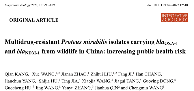 3. Kang Q, Wang X, Zhao J, et al. Multidrug‐resistant Proteus mirabilis isolates carrying blaOXA‐1 and blaNDM‐1 from wildlife in China: increasing public health risk[J]. Integrative Zoology, 2021, 16(6): 798-809.