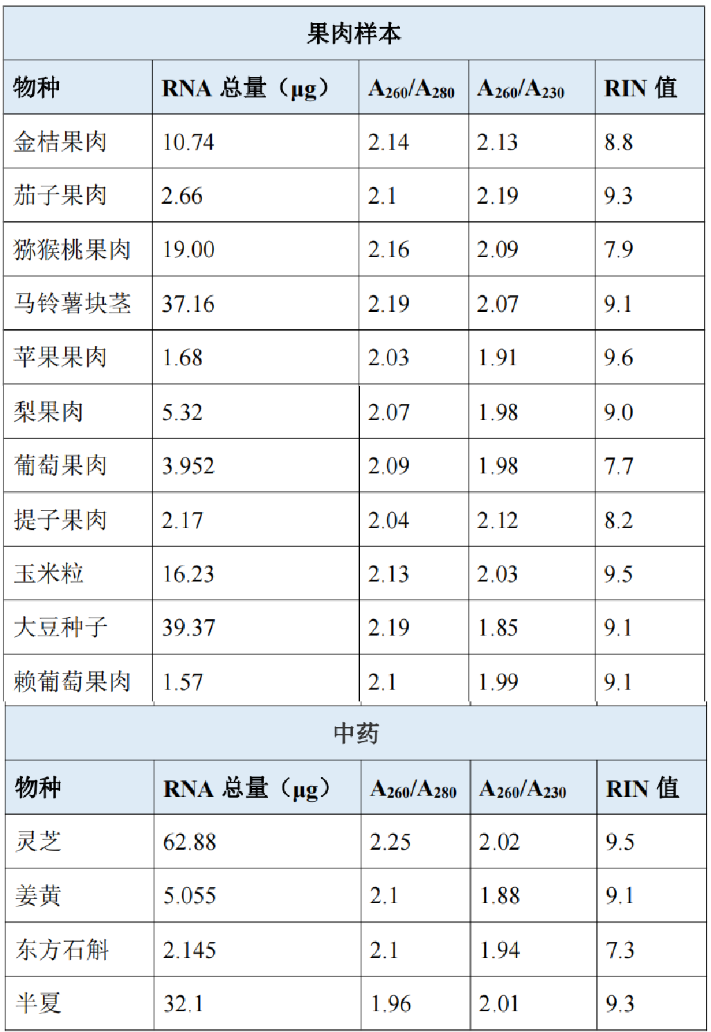 表2:果肉和中藥樣本,RNA濃度以及RIN值