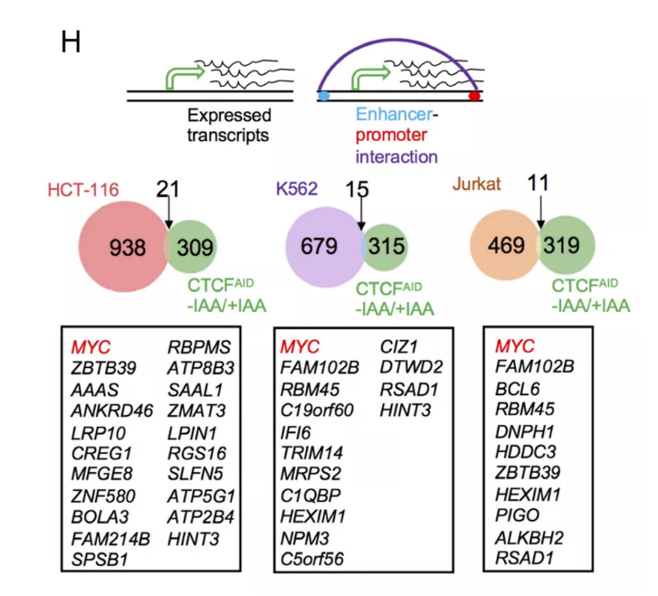 CTCF基因啟動子的染色質可及性在CTCF耗竭時也有所增加(圖3D),這一點通過定量PCR (Q-PCR)進一步得到驗證(圖3E)。這些數據表明CTCF可以抑制自身以保持最*表達水平。對于CTCF耗竭后被下調的基因,如MYC,并沒有在啟動子區(qū)域檢測到有統計學意義的染色質可及性變化。因此,當啟動子區(qū)域保持開放時,遠端增強子區(qū)域的染色質景觀變得更難以接近,再加上CTCF耗竭,可能在控制能調控MYC轉錄的遠端增強子-啟動子loop環(huán)的形成中發(fā)揮作用。