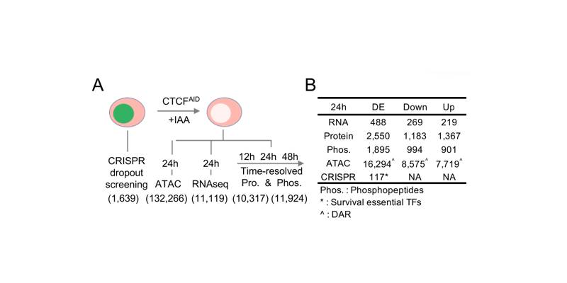 CCCTC-結合因子(CTCF)是一種高度保守的含鋅指轉錄因子,被稱為“基因組編織大師”。它是研究最廣泛的三維(3D)染色質結構調控因子。研究發(fā)現在CTCF急性衰竭細胞模型和其他基因敲除模型中,CTCF在全基因組TAD和TAD內部loop環(huán)的形成中是不可或缺的。為了更好地理解CTCF結合占用率如何促進轉錄調控,本文系統地進行了多組學研究,特別關注染色質可及性。通過系統整合了ATAC-seq、RNA-seq, WGBS, Hi-C, Cut&Run和CRISPR-Cas9基因篩選技術,以及深度蛋白質組學和磷酸化蛋白質組學分析,用以研究CTCF蛋白急性耗竭對細胞的影響。