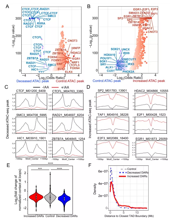 接下來分析這些DARs與它們最近的CTCF motif之間的物理距離。結果表明,可及性減弱的DARs更接近于最近的CTCF motifs。相比之下,可及性增強的DARs與CTCF motif的距離顯著高于可及性減弱的DARs,但顯著低于對照組(圖1E)。