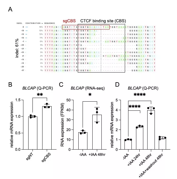 為了進一步驗證預測的假定絕緣子的作用,將慢病毒表達的引導RNA感染表達Cas9的SEM細胞中,然后進行抗生素選擇。Sanger基因組測序(Inference of CRISPR edit, ICE)在目標人群中檢測到約61%的總indel頻率(圖5A),與非靶向導向對照組(sgNT)相比,導致BLCAP mRNA表達顯著增加(圖5B)。用IAA處理CTCFAID細胞24和48小時,然后洗脫IAA進行CTCF修復。通過RNA-seq分析和Q-PCR驗證,驗證急性CTCF蛋白耗竭時BLCAP mRNA的表達(圖5C)。不出所料,生長素處理24或48 h后CTCF蛋白急性耗竭,BLCAP表達水平顯著升高。更重要的是,洗脫生長素后,其表達水平恢復到親本細胞的水平(圖5D)。綜上所述,這些數據有力地支持了CTCF在BLCAP調控區(qū)域的占用充當了控制BLCAP表達的功能絕緣體。