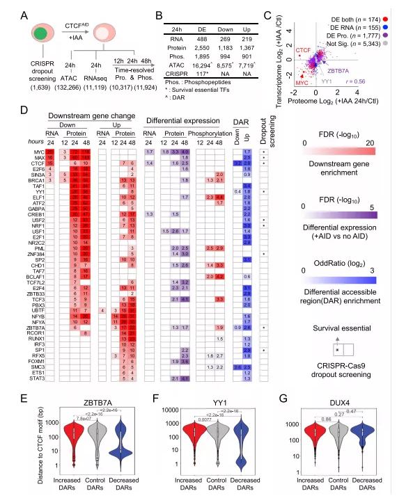 本文開發(fā)了一種多組學聯合的方法來定義CTCF共調控轉錄因子,總共鑒定了40個CTCF共同調控因子,這些TF在急性CTCF耗竭時在mRNA和/或蛋白質水平上顯著影響其下游靶基因的表達(圖6D)。正如預期的那樣,這40個CTCF共調控因子中的大多數也在CTCF介導的DARs中有共同定位,證實了它們與CTCF有著潛在的直接共同調控作用。