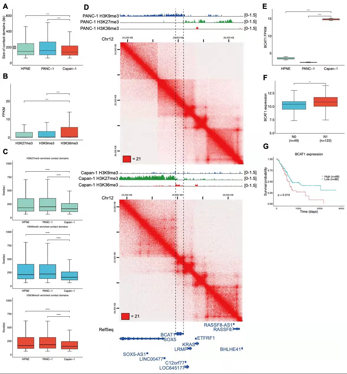 通過Chip數(shù)據(jù)分析,與轉(zhuǎn)移癌相比,原發(fā)癌具有更高的H3K27me3富集的特異性TAD,表明轉(zhuǎn)移過程中,非活性的TAD轉(zhuǎn)變?yōu)榛钚缘腡AD。例如BCAT1基因,是重新編程支鏈氨基酸代謝所必需的,位于新的富含H3K36me3的TAD中(圖2d),并且其表達(dá)量顯著升高升高(圖2e)。根據(jù)TCGA數(shù)據(jù)集顯示,BCAT1在有淋巴結(jié)轉(zhuǎn)移的胰腺癌樣本中BCAT1表達(dá)上調(diào)(圖2f)(p=0.02,Student t檢驗(yàn)),并且BCAT1表達(dá)與總生存率呈負(fù)相關(guān)(圖2g)(p=0.028,對(duì)數(shù)秩檢驗(yàn))??傊?,這些結(jié)果表明,在胰腺癌轉(zhuǎn)移過程中,結(jié)構(gòu)域的分裂可能與表觀遺傳狀態(tài)的改變相結(jié)合。