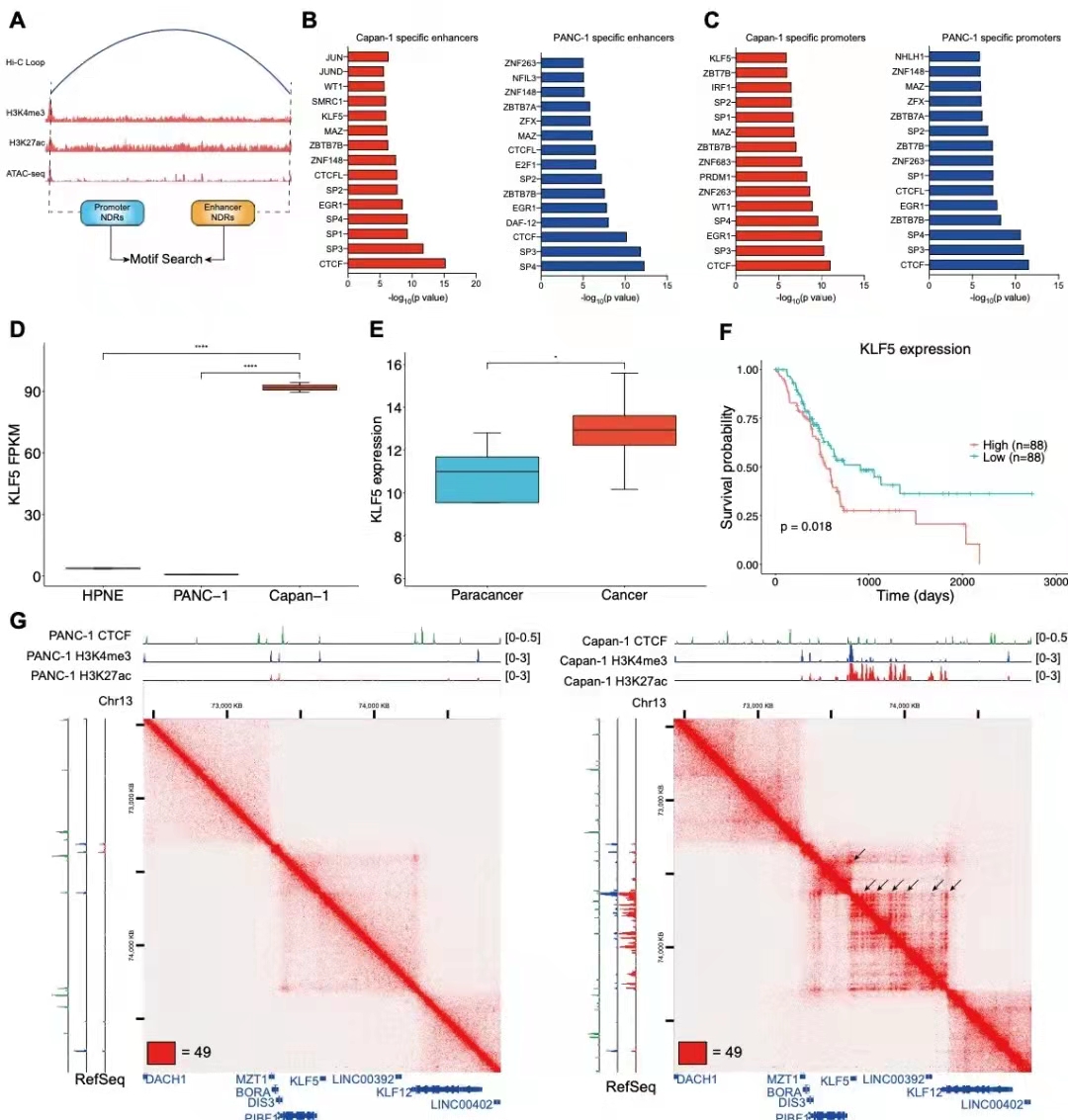 先前的研究表明KLF5對(duì)胰腺癌的進(jìn)展至關(guān)重要,而在本次研究中,KLF5的motif在轉(zhuǎn)移特異性增強(qiáng)子和相應(yīng)的啟動(dòng)子處富集(圖6b-c)。RNA-seq分析顯示KLF5在轉(zhuǎn)移癌細(xì)胞中顯著上調(diào)(圖6d)。此外,通過TCGA數(shù)據(jù)分析,發(fā)現(xiàn)胰腺癌樣本中KLF5的表達(dá)高于正常樣本(圖6e),并且KLF5的高表達(dá)與胰腺癌患者的不良預(yù)后相關(guān)(圖6f)。利用多組學(xué)數(shù)據(jù),作者確定了轉(zhuǎn)移癌細(xì)胞中KLF5啟動(dòng)子區(qū)域的特有的幾個(gè)增強(qiáng)子(圖6g,黑色箭頭)??傊?,轉(zhuǎn)移特異性增強(qiáng)子環(huán)到幾個(gè)關(guān)鍵TFs的啟動(dòng)子,這些TFs可以介導(dǎo)額外的增強(qiáng)子啟動(dòng)子成環(huán)來(lái)上調(diào)與胰腺癌轉(zhuǎn)移相關(guān)的基因。