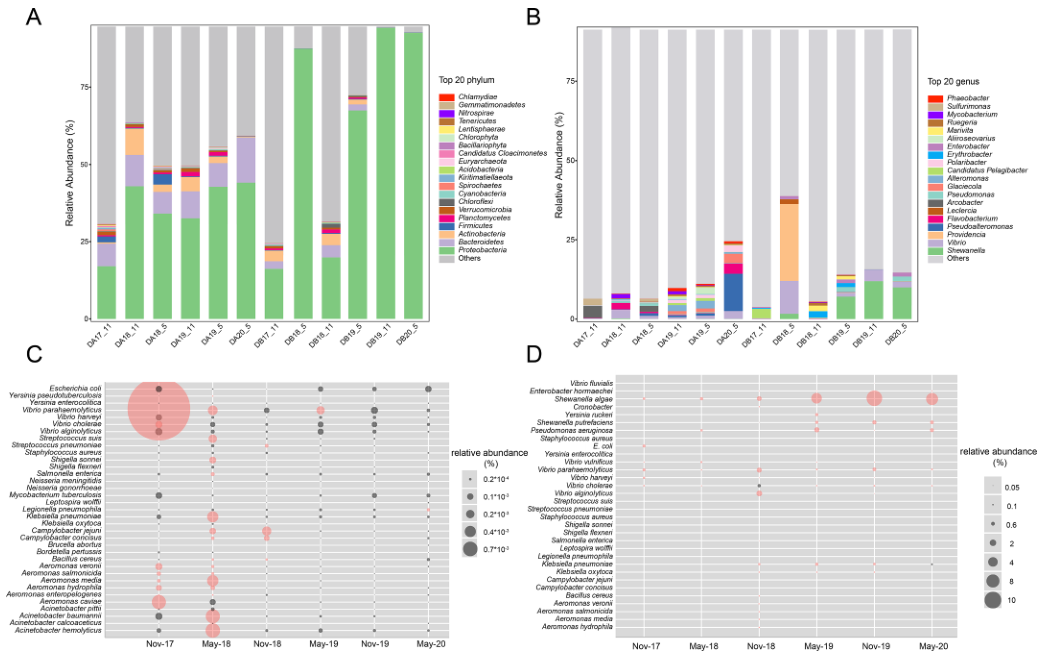 宏基因組數(shù)據(jù)中大約90%的reads與細(xì)菌相對應(yīng)。DA樣品中,變形菌門數(shù)量最多,其次是疣微菌門和放線菌(分別為35%和58%)(圖4A)。DB樣品中,變形菌門從2017年的50.1%增加到2020年的84.7%(圖4A)。兩個(gè)地點(diǎn)的微生物組成自2018年11月后出現(xiàn)了差異。在每個(gè)采樣時(shí)間,豐度 top20屬代表了微生物群落的35%到57%(圖5B)。在2019年(5.8%)和2020年(4.8%)采集的樣品中發(fā)現(xiàn)了弧菌屬(Arcobacter),而氣單胞菌屬(Aeromonas)和弧菌屬(Vibrio Spp)在2017年11月達(dá)到峰值(分別為0.43%和4.1%),在DA中還檢測到其它幾種細(xì)菌病原體(圖5C),所有時(shí)間均檢出假結(jié)核耶爾森菌(Yersinia pseudotuberculosis),2018年5月達(dá)到峰值(0.00013%),其他菌種也達(dá)到峰值,如不動(dòng)桿菌屬、肺炎克雷伯菌屬等?;谂囵B(yǎng)的分析證實(shí),DA和DB位點(diǎn)分別存在22種和18種致病物種(圖5C,D)。對兩個(gè)城市的宏基因組數(shù)據(jù)進(jìn)行直接分類。每個(gè)數(shù)據(jù)集中的宏基因組組裝基因組(MAG)數(shù)量從7到23個(gè)不等,相對豐度在0.215%到1.325%之間。然而,對MAGs的注釋結(jié)果表明,它們都不含有毒力因子,說明該方法只能檢測高豐度的病原體。