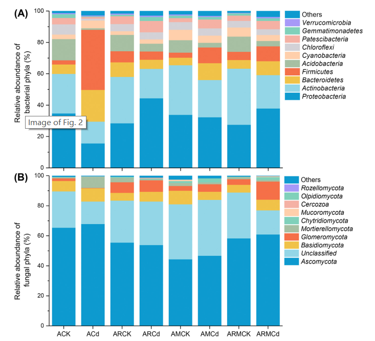 我們的研究在所有不同的處理中檢測到了10個細菌門類(相對豐度>1%),即變形菌門(Proteobacteria)、放線菌門(Actinobacteria)、擬桿菌門(Bacteroidetes)、厚壁菌門(Firmicutes)、酸桿菌門(Acidobacteria)、藍藻細菌門(Cyanobacteria)、綠彎菌門(Chloroflexi)、髕骨細菌門(Patescibacteria)、芽單胞菌門(Gemmatimonadetes)和疣微菌門(Verrucomicrobia) (圖2A)。相對豐度<1%的其他種群被歸為”Others”。在所有處理中,Bacteroidetes、Actinobacteria、Proteobacteria和Firmicutes是主要的細菌門。Cd添加、接種及其相互作用顯著影響了Firmicutes、Bacteroidetes和Acidobacteria的相對豐度。特別是Cd的添加,明顯降低了所有接種(AR、AM和ARM)處理中Actinobacteria的相對豐度,而增加了兩個接種(AM和ARM)處理中Firmicutes的相對豐度。