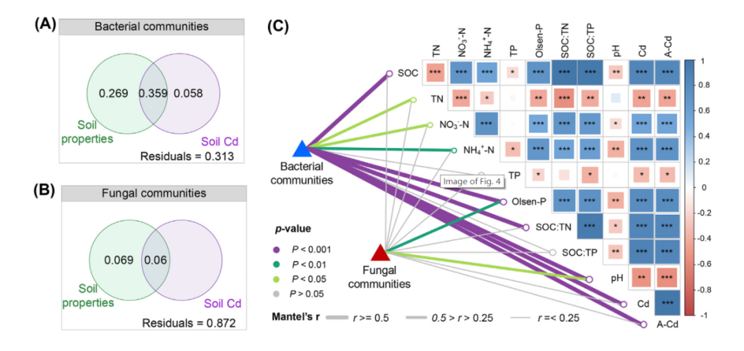Pearson相關(guān)分析發(fā)現(xiàn),Cd、OTU和細菌群落的α多樣性指數(shù)(即Shannon、Simpson、Chao1和ACE)之間存在顯著的相關(guān)性(P<0.05)。除Shannon指數(shù)外,SOC、TN、SOC:TN和SOC:TP與OUT以及細菌群落中的這些α多樣性指數(shù)之間存在顯著的相關(guān)性。但是,除了真菌群落的OTU和Shannon與SOC和SOC:TN外,真菌群落的α多樣性指數(shù)與這些土壤性質(zhì)之間沒有發(fā)現(xiàn)明顯的相關(guān)性。
