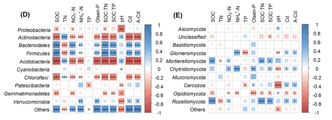 VPA的結(jié)果表明,土壤性質(zhì)和Cd含量一般能解釋細菌群落的大部分變化(62.8%),而它們只能解釋真菌群落12.9%的變化(圖4A和B)。Mantel檢驗和相關(guān)分析表明,除TP和SOC:TP外,其他土壤變量均與細菌群落顯著相關(guān),而只有Olsen-P和pH值對真菌群落有顯著影響(圖4C)。此外,RDA還證實,與不同處理的真菌群落相比,土壤變量對不同處理的細菌群落有更明顯的影響。根據(jù)相關(guān)性熱圖和RDA或CCA,細菌群落中的Actinobacteria、Bacteroidetes、Firmicutes、Acidobacteria和Chloroflexi與除TP外的其他土壤變量顯著相關(guān)(P<0.05;圖4D)。然而,在真菌群落中,只有Chytridiomycota、Olpidiomycota和Rozellomycota與大多數(shù)土壤變量表現(xiàn)出明顯的相關(guān)性(P <0.05;圖4E)。