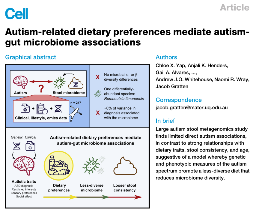 [3] Yap C X, Henders A K, Alvares G A, et al. Autism-related dietary preferences mediate autism-gut microbiome associations[J]. Cell, 2021, 184(24): 5916-5931. e17.