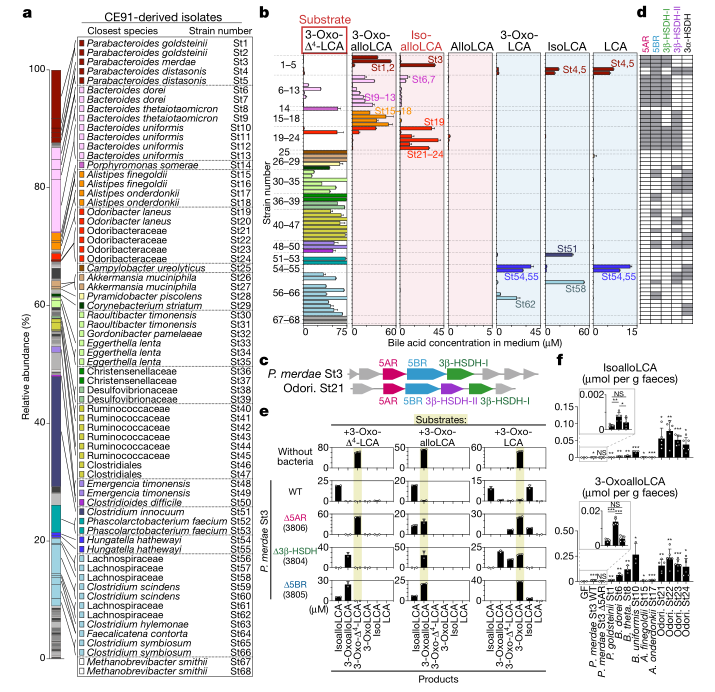 長期以來,微生物組一直被認為是決定老年人健康狀況的關鍵因素,因為它在控制消化功能、骨密度、神經(jīng)活動、免疫力和對病原體感染的抵抗力方面發(fā)揮著作用。百歲老人對衰老相關疾病、慢性炎癥和傳染病的易感性降低。在該研究中,發(fā)現(xiàn)百歲老人有一個獨特的腸道微生物組,其中富含能夠產(chǎn)生獨特的次級膽汁酸的微生物,包括各種異構體的石膽酸(LCA):3-oxo-,allo-,3-oxoallo-和isoallolithocholic acid。在這些膽汁酸中,isoalloLCA的生物合成途徑從未被報導過。從一名百歲老人糞便微生物群中篩選出了68株細菌,在體外和體內(nèi)都鑒定了Odoribacteraceae菌株是產(chǎn)生同種isoalloLCA的有效菌株。此外,還發(fā)現(xiàn)5-羥基類固醇脫氫酶(3-α-β-HSDH)和5-羥基類固醇脫氫酶(5-β-reductase,5AR)負責isoalloLCA的產(chǎn)生。IsoalloLCA對革蘭氏陽性多重耐藥病原菌,包括艱難梭狀芽胞桿菌和屎腸球菌有很強的抗菌活性。這些發(fā)現(xiàn)表明,特定膽汁酸的代謝可能與降低感染病原體的風險有關,從而可能有助于維持腸道內(nèi)環(huán)境的穩(wěn)定。