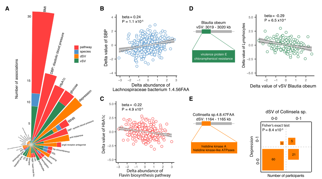 人的腸道中有各種各樣的微生物群落,這些微生物在個體間表現(xiàn)出很大的變異。該研究通過對腸道微生物群、51個人類表型和338個個體的1183個代謝物的血漿水平進行4年的跟蹤調(diào)查,描述了微生物的穩(wěn)定性和變異與宿主生理的關系。利用這些個體特異性和時間穩(wěn)定的微生物圖譜,包括細菌SNPs和結構變異,開發(fā)了一種微生物指紋圖譜方法,在對相隔4年的宏基因組樣本進行分類時,準確率高達85%。將該指紋方法應用到獨立的HMP隊列中,對于相隔1年的樣本,準確率為95%。進一步觀察了多種細菌種類的豐度、代謝途徑、結構變異以及菌株替換的時間變化。報告了190個縱向微生物與宿主表型相關,519個與血漿代謝物相關。這些關聯(lián)包含心臟代謝特征、維生素B和尿毒癥毒素。最后,中介效應分析表明腸道微生物群可能通過其代謝產(chǎn)物影響心臟代謝健康。