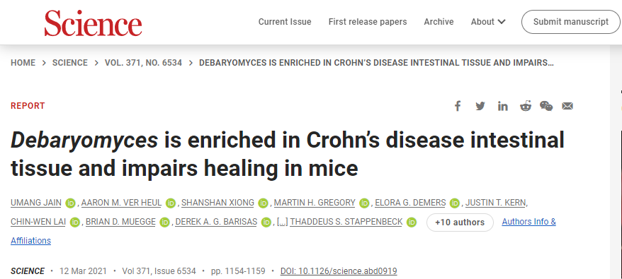3月:Science:漢斯德巴氏酵母菌在克羅恩病的腸組織中大量存在,并損害小鼠的愈合