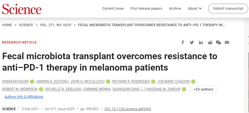 2月:Science:糞菌移植能夠克服黑色素瘤患者對PD-1免疫療法的耐藥性