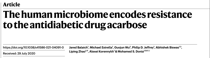 [2] Balaich J, Estrella M, Wu G, et al. The human microbiome encodes resistance to the antidiabetic drug acarbose[J]. Nature, 2021, 600(7887): 110-115.