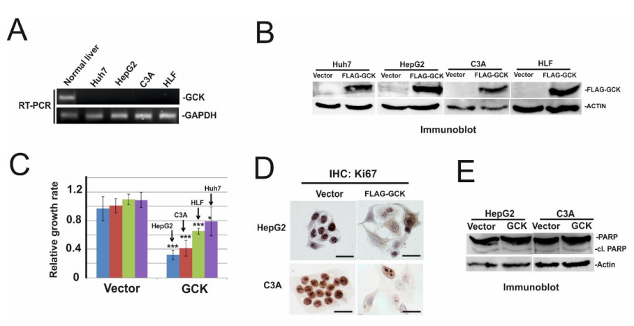 由于葡萄糖代謝的重編程是 HCC 的標(biāo)志之一,進(jìn)一步關(guān)注表征一種TSG 候選物 – 葡萄糖激酶 (GCK) 的抗增殖作用。為了檢驗(yàn)GCK是否可能在HCC 細(xì)胞中發(fā)揮抑癌基因的作用,首先分析了GCK在正常人肝臟和四種HCC細(xì)胞系中的表達(dá),即Huh7、HepG2、C3A 細(xì)胞和 HLF 細(xì)胞(圖3A)。發(fā)現(xiàn)GCK在正常肝臟中高表達(dá),在Huh7、HepG2、C3A細(xì)胞和HLF細(xì)胞中未檢測到有表達(dá)。然后在這些細(xì)胞系中過表達(dá)帶有FLAG 標(biāo)記的GCK(圖3B) ,并使用結(jié)晶紫實(shí)驗(yàn)檢查細(xì)胞生長。GCK 的過表達(dá)強(qiáng)烈抑制 HepG2 和 C3A 細(xì)胞的生長,而在 HLF 和 Huh7 細(xì)胞中生長抑制的效果不太明顯,但仍很顯著(圖3C)。利用增殖標(biāo)記物Ki67進(jìn)行的免疫組化染色證實(shí)了過表達(dá)GCK的HepG2和C3A細(xì)胞生長受到抑制(圖3D)。為了檢查GCK過表達(dá)后HepG2和C3A細(xì)胞的減少,是否是因?yàn)樵鲋呈艿揭种坪褪艿降蛲稣T導(dǎo),對凋亡標(biāo)記物PARP進(jìn)行了免疫印跡雜交實(shí)驗(yàn)。如圖3E所示,在GCK過表達(dá)的細(xì)胞中PARP沒有增加。這些數(shù)據(jù)表明GCK的過表達(dá)抑制細(xì)胞增殖但不誘導(dǎo)細(xì)胞凋亡。