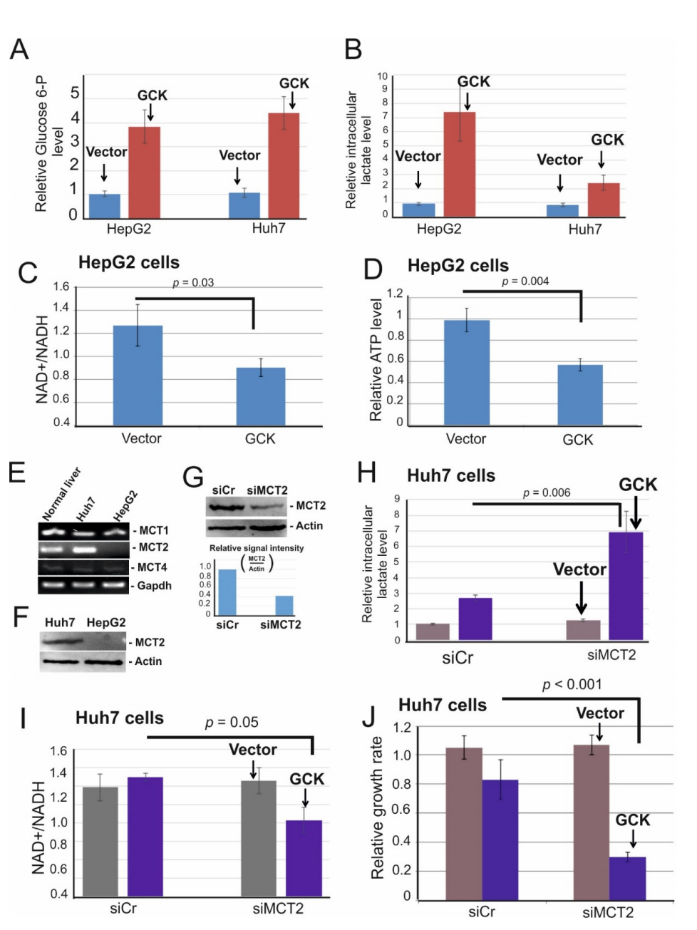 由于GCK過表達(dá)并未強(qiáng)烈誘導(dǎo)Huh7細(xì)胞中的乳酸積累,這就提出了乳酸是如何在這些細(xì)胞中外排的問題。乳酸外排由雙向單羧酸轉(zhuǎn)運(yùn)體(MCTs)介導(dǎo),已知有四種MCT可轉(zhuǎn)運(yùn)乳酸,因此檢測了在 Huh7 和 HepG2 細(xì)胞中MCT變異體的表達(dá)。有趣的是,HepG2細(xì)胞僅表達(dá)MCT1和MCT4,而Huh7 細(xì)胞表達(dá)了三種變異體(圖4E)。還通過免疫印跡雜交實(shí)驗(yàn)證實(shí)了HepG2 細(xì)胞中缺乏 MCT2的表達(dá)(圖4F)。這些數(shù)據(jù)提出了隨后的問題,即細(xì)胞內(nèi)乳酸積累是否由于HepG2細(xì)胞中缺乏MCT2所致。為了檢驗(yàn)這種可能性,耗盡了GCK過表達(dá)的Huh7細(xì)胞中的MCT2(圖4G) 并檢測了細(xì)胞內(nèi)乳酸的濃度。事實(shí)上,MCT2 的消耗顯著誘導(dǎo)了乳酸的積累(圖4H)。因此,在MCT2耗盡的細(xì)胞中,NAD+/NADH 比率顯著下降(圖4I) 并伴隨細(xì)胞增殖的減少(圖4J)??傊?,這些數(shù)據(jù)表明MCT2的缺乏在GCK過表達(dá)的細(xì)胞中顯著積累了乳酸。